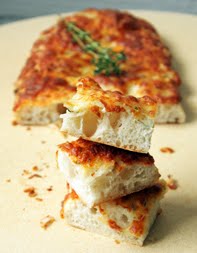 3. Preheat the oven to 500°; if you're using a pizza stone, place it in the oven while it is preheating. Remove the dough balls from the refrigerator and stretch them into two 10-inch-long rectangles, about ½-inch thick. Rub each portion of dough with a tablespoon of olive oil and season with salt and pepper. Spread 2 teaspoons of garlic evenly over each portion of dough. Top each portion with 1 teaspoon fresh thyme and ¾ cup mozzarella. Place the breads on the preheated stone, if using; otherwise, place on a large sheet pan and bake until the breads are crispy and the cheese browned, about 10 minutes.