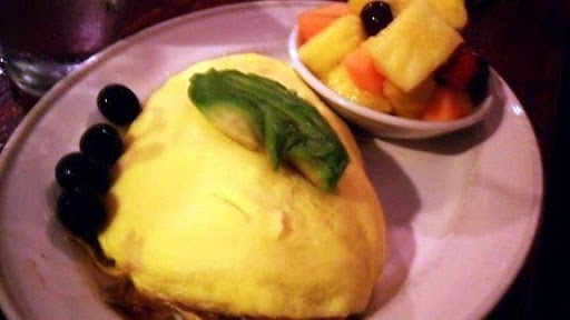 Remove the lid and add the warm chicken, tomato, green onion and bacon mixture to one half and turn the omelet out of the pan, folding the empty side over the side with the mixture using the lip of the pan. Top the omelet with avocado and blue cheese and serve immediately.