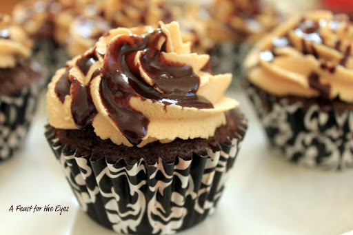 Yes, that’s a mouthful! I found this recipe on “How Sweet It Is” and decided to make it—would you believe, my reason was that I’m not that fond of peanut butter? I figured I’d be able to resist these treats that I baked for my family. After tasting the moist chocolate cupcake, filled with a peanut butter buttercream frosting, and drizzled with a homemade hot fudge sauce…well, I’m a convert! The frosting has just the right amount of peanut flavor, without being overwhelming. These are so good, and I love the tip on how to easily fill the inside of the cupcake, and to frost them.