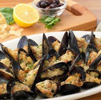 Baked Stuffed Mussels with Focaccia and Lemon appetizer