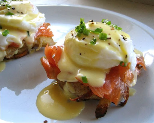 6. On each plate, place two English muffin halves, face-up. Then place a thin layer of smoked salmon on each. Then a layer of spinach (drained). Then a poached egg. Drizzle hollandaise in a zig-zag pattern over the towers and serve.