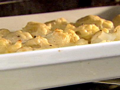 Pour 1/3 of the sauce on the bottom of an 8 by 11 by 2-inch baking dish. Place the drained cauliflower on top and then spread the rest of the sauce evenly on top. Combine the bread crumbs with the remaining 1/4 cup of Gruyere and sprinkle on top. Melt the remaining 2 tablespoons of butter and drizzle over the gratin. Sprinkle with salt and pepper. Bake for 25 to 30 minutes, until the top is browned. Serve hot or at room temperature.