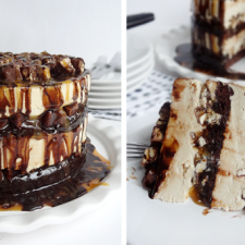 2. Melt the remaining butter; place in a large bowl. Add ice cream; stir to blend. Add eggs, one at a time, beating well after each addition; stir in the remaining vanilla. In another bowl, mix the flour, cracker crumbs, sugar, baking powder and salt; gradually stir into ice cream mixture.