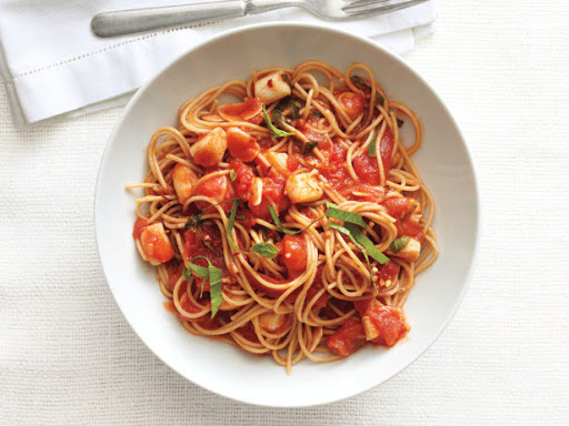 Increase the heat under the sauce to medium high, add the scallops and cook, stirring occasionally, until opaque, about 5 minutes. Remove the parmesan rind, add the remaining basil and season with salt and more red pepper flakes.