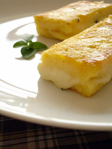 Cut into squares/rectangles and brush with oil. Heat a char-grill pan or barbecue over high heat. Cook the polenta for 3-4 minutes each side or until golden and the cheese has melted. Serve with pan-fried veal cutlets, grilled lamb or steak and baby spinach.