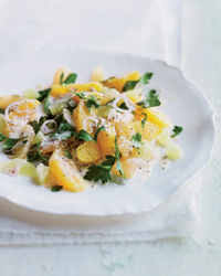 Using a sharp knife, carefully peel the oranges, red grapefruits and limes, removing all of the bitter white pith. Working over a small bowl to catch the juices from the fruit, cut in between the membranes to release the sections. Cut the lime and grapefruit sections into thirds and leave the orange sections whole. Transfer all of the citrus to a serving bowl and add the sliced shallot and chopped parsley. Reserve the citrus juice for another use.