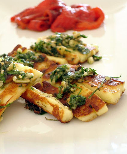 Place the pine nuts, garlic, parsley, olive oil, salt and pepper in the bowl of a small food processor and process in short bursts until just combined. Spread the pine nut mixture on the haloumi. Heat the extra olive oil in a large non-stick frying pan over high heat. Cook the haloumi for 1-2 minutes each side or until browned.