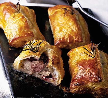 1 For stuffing:. 2 Combine all ingredients and blend well. 3 Cover and refrigerate. 13 For lamb:. 14 Preheat oven to 450 degrees. 15 Set butterflied lamb skin side down on working surface. 16 Pound to flatten slightly. 17 Mix butter,garlic,salt and pepper to a paste; rub half thoroughly into lamb. 18 Spread with stuffing and reshape leg. 19 Sew closed with string;tie crosswise at 1 inch intervals and twice around length to hold stuffing. 20 Rub outside with remaining butter mixture, then rub with rosemary. 21 Set on rack in roasting pan and roast 20 minutes. 22 Reduce oven temperature to 350 and roast an additional 40 minutes. 23 Let cool, then remove string and brush off excess rosemary. 24 * Lamb can be prepared ahead to this point. Wrap in plastic wrap and refrigerate up to 24 hours.Don't start the pastry until you take the lamb out of the refrigerator. 25 Lightly oil shallow roasting pan. 26 Knead dough once again. 27 Roll out enough dough on lightly floured surface to make rectangle 1/4 inch thick, large enough to completely enclose lamb with a 1 inch overlap. 28 Set lamb on one end of rectangle. 29 Beat yolks with milk and brush some on edges of dough;fold dough over lamb. 30 Press seams together; trim and reserve excess dough. 31 Set seam side down in roasting pan and brush with some of yolk. 32 Preheat oven to 450 degrees. Roll excess dough into long thin ropes. Braid in threes to go around top perimeter of lamb. 33 Remaining dough can also be made into smaller and thinner ropes and/or worked into more intricate designs such as leaves,tiny birds, flowers and coiled snakes inside the encircling braid, all symbols of Easter in Greece. 34 Brush decorations with yolk mixture. 35 Bake until pastry sets, about 15 minutes. 36 Reduce oven temperature to 300 degrees and bake an additional 20 to 30 minutes(use a meat thermometer to check doneness). 37 Transfer to heated platter and garnish with fresh mint sprigs, if desired. 38 Let stand several minutes before slicing.
