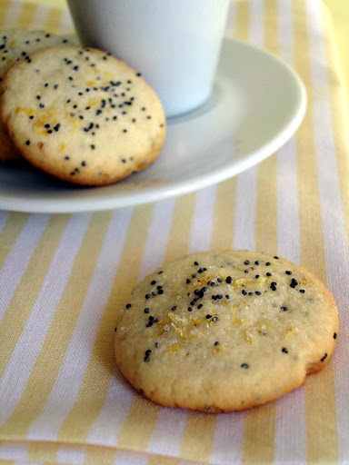 In a plate, combine the remaining ¼ cup of sugar (50g) with 1 teaspoon of lemon zest – rub the sugar and zest between your fingertips to obtain a lemony sugar. Roll leveled ½ tablespoons of dough into small balls and place on a prepared cookie sheet, 5cm (2in) apart. Using a very slight moist glass, dip the bottom into sugar mixture and flatten cookies, follow by sprinkling a few poppy seeds and a pinch of the sugar+zest mix over the top of each cookie.