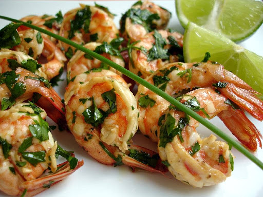 Remove the shrimp from the refrigerator and strain any juices – remove the garlic slices, also. Drizzle the remaining olive oil over the shrimp and toss to combine. Heat a large frying pan over medium-high heat. Add the shrimp, turning to avoid burning. Cook until the shrimp turn pink, about 2 minutes each side – don’t overcook, or they will become rubbery.