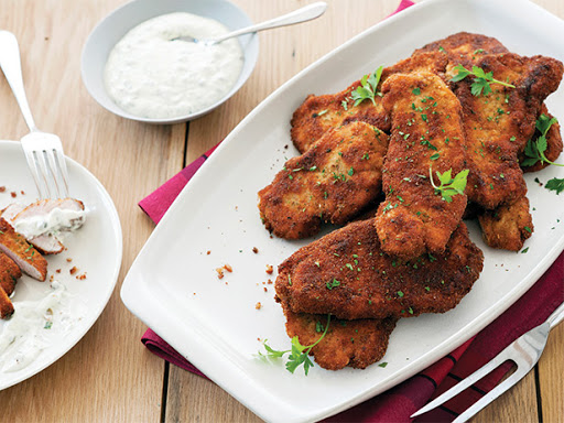 For the Pork Milanese: Combine the flour and the 1/2 teaspoon salt and pepper in a shallow dish and stir together. Crack the eggs into another shallow dish and beat until combined. In a third shallow bowl, place the breadcrumbs. Season the pork with salt and pepper. Dip the pork, 1at a time first in the flour, then the eggs, then the bread crumbs. Warm the vegetable in a large skillet over medium heat. When the oil is hot place the breaded pork in the pan. Cook until golden and cooked through, about 4 to 5 minutes per side. Transfer the pork to a serving platter and serve with the sauce alongside.