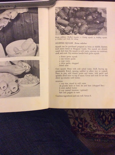 Core squash. Rinse with cold salted water. Stuff, leaving approximately 3/4 inch opening unfilled to allow rice to expand. Place in pan, add tomato puree and water. Add garlic and sprinkle dried mint on top of sauce. Cover and cook on low fire about 35 minutes until tender.