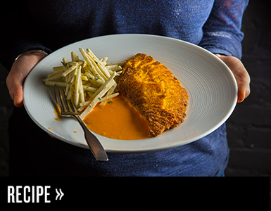 5. Set a large skillet over medium-high heat. Add enough oil to coat it well, about 3 to 4 tablespoons. Place half of the buffalo sauce in a shallow bowl and the cornmeal in another. Season the skate wings on both sides with salt and pepper. Coat the wings in the Buffalo sauce, shaking off excess, and then dredge in the cornmeal to cover. Add the skate to the hot oil and sear until golden brown, about 1½ to 2 minutes (you may need to cook the skate in batches to avoid crowding the pan). Flip and cook the second side until golden brown, about 1½ to 2 minutes more. Transfer to a paper towel-lined plate. Serve with the remaining Buffalo sauce and the celery root rémoulade.