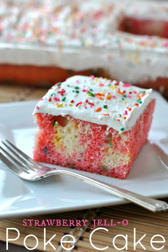 3.In a small bowl, mix gelatin with boiling water. Stir until sugar is dissolved. Pour gelatin over cake slowly, allowing it to fill the holes in the cake. Top with Cool Whip and sprinkles. Refrigerate for 4 hours, or overnight. ENJOY!