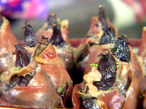 Wrap a piece of prosciutto around each to enclose like a little cocoon. Stand the figs on a sheet pan. Bake for 12 to 15 minutes so the prosciutto melts slightly and forms a skin around the figs. Season with lots of ground black pepper. These are terrific hot or at room temperature