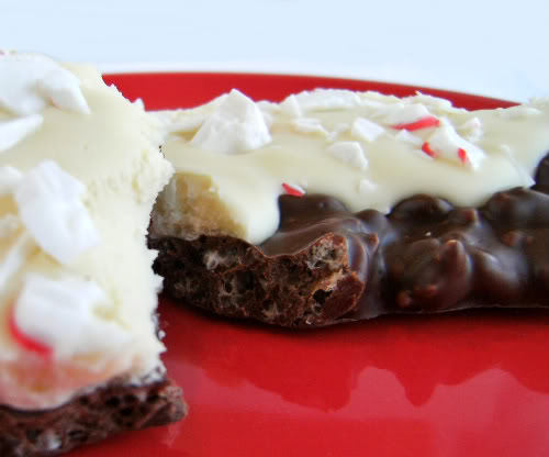 Melt the white chocolate in a bowl over a pan of simmering water. Pour over the bittersweet chocolate. Sprinkle on the peppermint chunks.