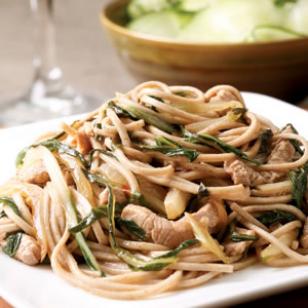 Whisk the cornstarch mixture again, add it to the pan and bring to a boil. Cook, stirring, until the sauce has thickened, 2 to 4 minutes. Serve the pork and vegetables over the noodles.