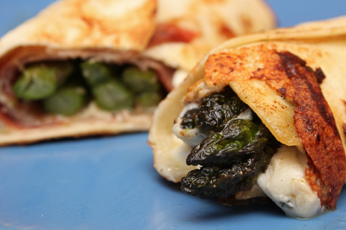 sweet roasted asparagus, creamy mozzarella, and the salty kick of prosciutto are winners wrapped up together in a pan-fried tortilla; fava bean and potato soup is sweet and satisfying, even if you don't bother to blend each component separately