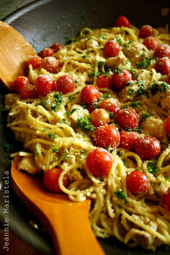 Spaghetti in Garlic Gravy with Herbs and Lemon Marinated Chicken and Cherry Tomatoes