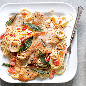 3. Heat remaining 2 Tbsp. oil in skillet; add sage. Cook, stirring often, 2 to 3 minutes or until crisp and fragrant. Remove with a slotted spoon; drain on paper towels. Add shallots, and sauté 2 to 3 minutes or until tender. Add wine, and cook 3 to 4 minutes or until mixture is reduced by half, stirring to loosen brown bits from bottom of skillet. Add broth, next 2 ingredients, and turkey. Bring to a boil over medium-high heat; reduce heat to medium-low, and simmer 10 minutes or until mixture is thickened. Sprinkle with Parmesan cheese. Serve over pasta; top with crispy sage leaves.