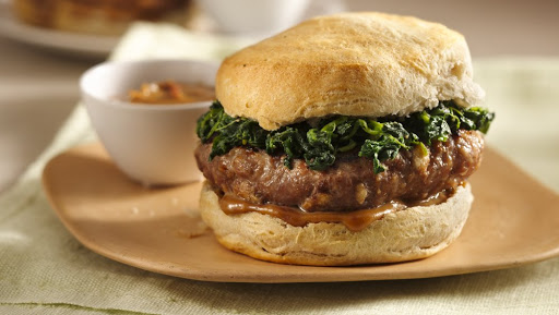 Split 6 remaining biscuits; spread 1 tablespoon peanut sauce on bottom of each biscuit. Top with burger, spinach and biscuit tops. Serve with remaining sauce.
