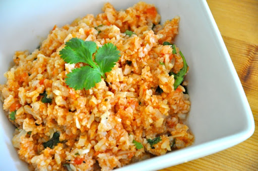 Mix the tomato blend evenly into the shredded cauliflower. Pour into prepared pan and bake for 20 minutes. Stir and bake for another 20 minutes.