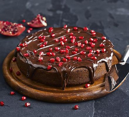 For the topping, bring the cream to the boil. Put the chocolate in a bowl with the icing sugar, then tip the hot cream over it. Leave for a few mins, stir until smooth, then let it cool and thicken for 10 mins. Carefully remove the torte from its tin onto a plate, then spread the icing over the top, letting it drip down the sides. Leave to set for a few mins, then scatter with the pomegranate seeds and either chill for a few hours, or serve straight away.