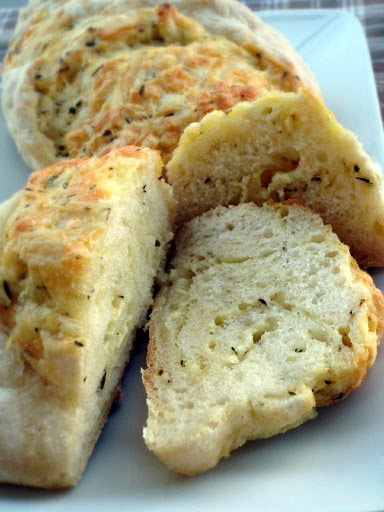 To make the dough: combine the risen starter with the water, salt, flour, and yeast. Knead by hand or with a stand mixer for a few minutes (I went with 5 minutes by hand, like Helen did). Place it in a lightly greased bowl, cover, and let it rise for 1 ½ to 2 hours, until it’s nearly doubled in size. Gently deflate the dough, and pat and stretch it into a ¾ inch-thick rectangle, about 9x12in (23x30cm). Spritz with water, and sprinkle with the grated cheese and the herbs. Starting with a long side, roll it into a log, pinching the seam to seal. Place the log, seam-side down, on a lightly floured or lightly oiled surface. Cover it and let it rise for 1 to 1 ½ hours, till it’s puffy though not doubled in size. Towards the end of the rising time, preheat the oven to 220ºC/425ºF. Gently cut the log into four crosswise slices, for mini-breads; or simply cut the dough in half, for two normal-sized loaves. Place them on one (for two loaves) or two (for four mini-loaves) lightly greased or parchment-lined baking sheets, cut side up. Spread them open a bit, if necessary, to more fully expose the cheese and close the other end. Spritz with warm water, and immediately place them in the preheated oven. Bake for 20 minutes (for the mini-loaves), or 35 minutes (for the full-sized loaves), or until the cheese is melted and the loaves are a very deep golden brown. Remove them from the oven, and cool on a rack.