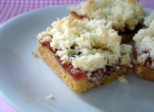 To make the topping, combine the sugar, egg and coconut. Sprinkle over the jam. Bake for 25 minutes or until golden. Cool in the pan. Cut into slices.