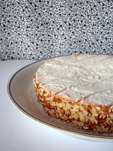 Spread the remaining buttercream on the sides of the cake and “stick” the chopped almonds on the cream. Using a sieve, sprinkle the top of the cake with the confectioners’ sugar. Draw a criss-cross pattern on the sugar using the back of a knife.