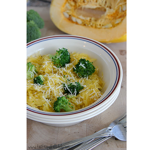 2.Using a fork, scrape out the flesh of the squash and put it in a serving bowl. Add in the broccoli, Parmesan and lemon pepper. Serve warm.