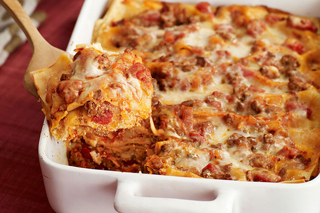 Drain meat; return to skillet. Stir in pasta sauce, tomatoes and oregano; simmer 5 min. Remove from heat. Spoon 1 cup meat sauce onto bottom of 13x9-inch baking dish; top with layers of 3 lasagna noodles, 1 cup cheese mixture and 1 cup meat sauce. Repeat layers twice. Top with remaining noodles, meat sauce, mozzarella and Parmesan; cover.