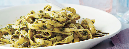 Cook fettuccine according to package directions. Drain, reserving ½ cup pasta water. Place fettuccine in a bowl. Add a little pasta water to pesto to loosen the sauce. Pour pesto over fettuccine. Toss and serve.