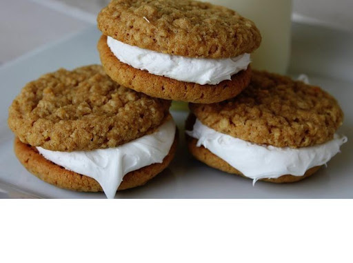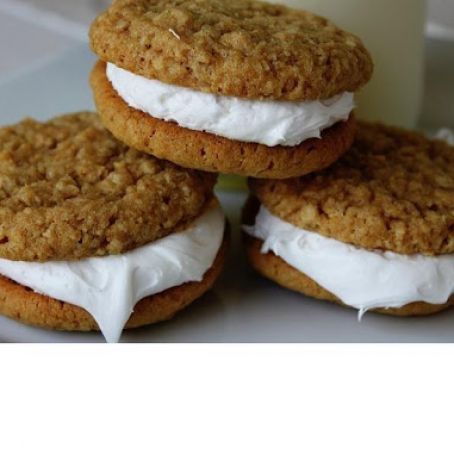 Whipped cream frosting is sandwiched between an oatmeal and peanut butter cookie for a wonderful combination of flavors.