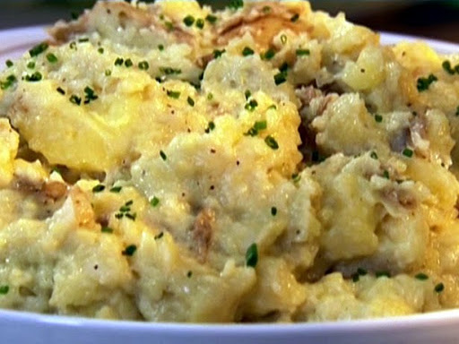 Meanwhile, heat butter and cream until hot. Add the crumbled blue cheese and stir together. Add sauce to potatoes and mash until smooth. Season with salt and pepper.