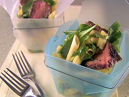 In a small bowl, whisk together the balsamic vinegar, Dijon mustard, 1/2 teaspoon salt, 1/2 teaspoon pepper, fresh herbs, and 3/4 cup olive oil. In a large bowl toss the pasta with half of the salad dressing and the reserved pasta water. Add the arugula and steak, more dressing, and season with salt and freshly ground black pepper, as needed. Toss, pack for the picnic, or serve.
