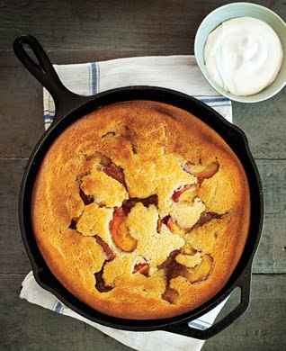 Add batter to pan. Scatter fresh peaches over, then spoon dollops of preserves evenly over batter.