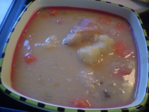 After about 3 minutes we can start adding some of the other ingredients like… black pepper, thyme, coconut milk, green seasoning and the hot pepper. Wash the split peas and also add this to the pot. The split peas and pig tails will take a long time to cook and get tender. Almost forgot… add the 8 cups of water, bring to a boil, then lower the heat to a gentle simmer. This will now have to cook for about 1 hr.