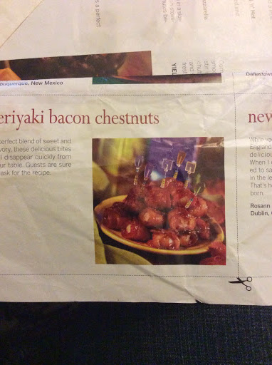 Broil until crispy, about 5 minutes on each side, drain well. Blend ham glaze with teriyaki sauce. Pour over chestnuts and bake for 20 min.