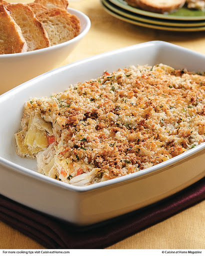 Gently stir in crabmeat. Transfer mixture to prepared dish, sprinkle with topping, and bake until gratin is golden, 25–30 minutes. Serve dip