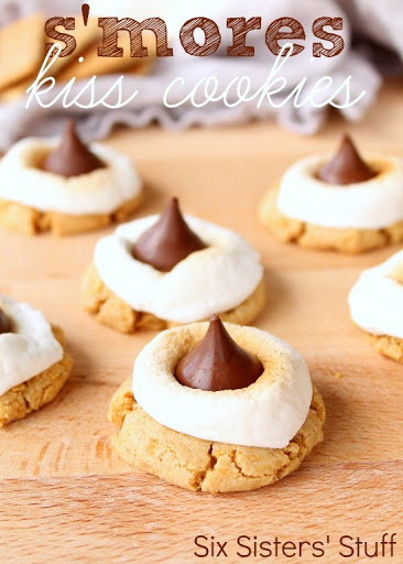 Preheat the oven to 350 degrees F.  In a large bowl, combine graham cracker crumbs, flour, baking soda, and salt.  Set aside. In another bowl, beat the butter and sugars together until creamy and smooth.  Add in the egg and vanilla extract and mix until combined.  Slowly add the dry ingredients and mix until just combined.  Drop rounded tablespoons of dough onto a baking sheet, 1-2" apart.  Bake for 6-8 minutes or until edges are just getting golden brown.  Remove from oven and gently press a half marshmallow, sticky side down, onto each cookie.  Let cool completely.  Once all cookies are cooled down, preheat broiler.  Place cookies back on baking sheets and broil for 1-2 minutes, keeping a close eye on them so they don't burn.  Once marshmallows are golden brown, remove from the broiler and place a chocolate kiss on top of each cookie.