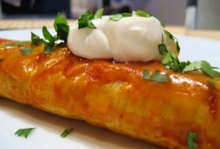 Spray a 9×13 pan (or one slightly smaller) with cooking spray. Place a tablespoon of sour cream and cheese in the center of each tortilla. Roll up each one and place in the pan. Pour enchilada sauce over it all and spread remaining sour cream and cheese on top. Cover and bake at 350° for 20-30 minutes or 250° for 45-60 minutes.
