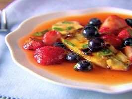 In another medium bowl, mix together the mint, lemon juice, and simple syrup. Arrange the fruit on a serving platter, drizzle the mint syrup over top, and serve.