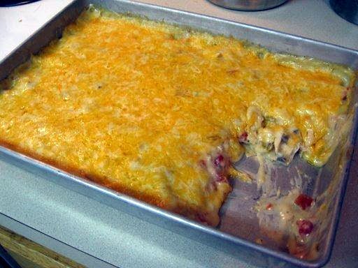 Grease casserole dish and break up tortillas in bottom (I use a pizza slicer to cut mine). Place cut up chicken on top. Mix soups and ro-tel and pour over chicken. Cover with shredded cheese. Bake at 350 for 20-30 minutes or until cheese is melted and golden brown.