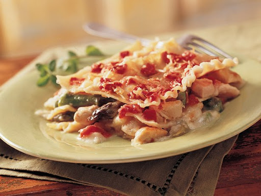4 Spread about 1/2 cup of the chicken mixture in baking dish. Top with 3 noodles, 1 1/2 cups chicken mixture, half of the asparagus and 1 cup of the mozzarella cheese. Repeat layers, starting with noodles. Top with remaining 3 noodles.