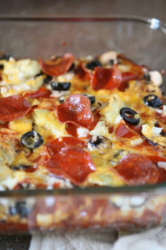 - any desired pizza toppings: pepperoni, sausage crumbles, olives, peppers, onions, etc.