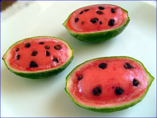 Cut the limes in half and scoop out the pulp. Fill with strawberry sorbet and chocolate chips to resemble watermelons. Place in freezer until ready to use. When ready to use, cut the halves into 2 wedges and serve.