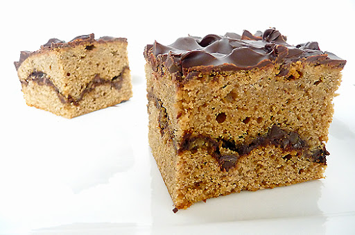 4. Scrape half of the batter into the pan and smooth the top. Sprinkle the chocolate over the batter and dust with the cinnamon-sugar mixture. Cover with the rest of the batter and smooth the top again.