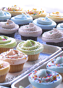 In a large bowl, on the medium speed of an electric mixer, cream the butter until smooth. Add the sugar gradually and beat until fluffy, about 3 minutes. Add the eggs, one at a time, beating well after each addition. Add the dry ingredients in three parts, alternating with the milk and vanilla. With each addition, beat until the ingredients are incorporated but do not overbeat. Using a rubber spatula, scrape down the batter in the bowl to make sure the ingredients are well blended. Carefully spoon the batter into the cupcake liners, filling them about three-quarters full. Bake for 20–25 minutes, or until a cake tester inserted in the center of the cupcake comes out clean.