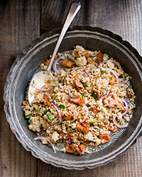 In a large bowl, toss together the cooked quinoa, bacon pieces, red onion and parsley. Toss with the dressing and serve at room temperature or chilled.